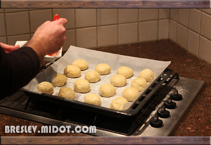 הבצק לאחר התפחה - הכפלת נפח הבצק; מקמחים את משטח העבודה; פורסים את הבצק ל26 חלקים; לוקחים חתיכה אחת לידיים; מגלגלים בידיים כדור בצק בגודל כדור טיפה יותר גדול מכדור פינג פונג;